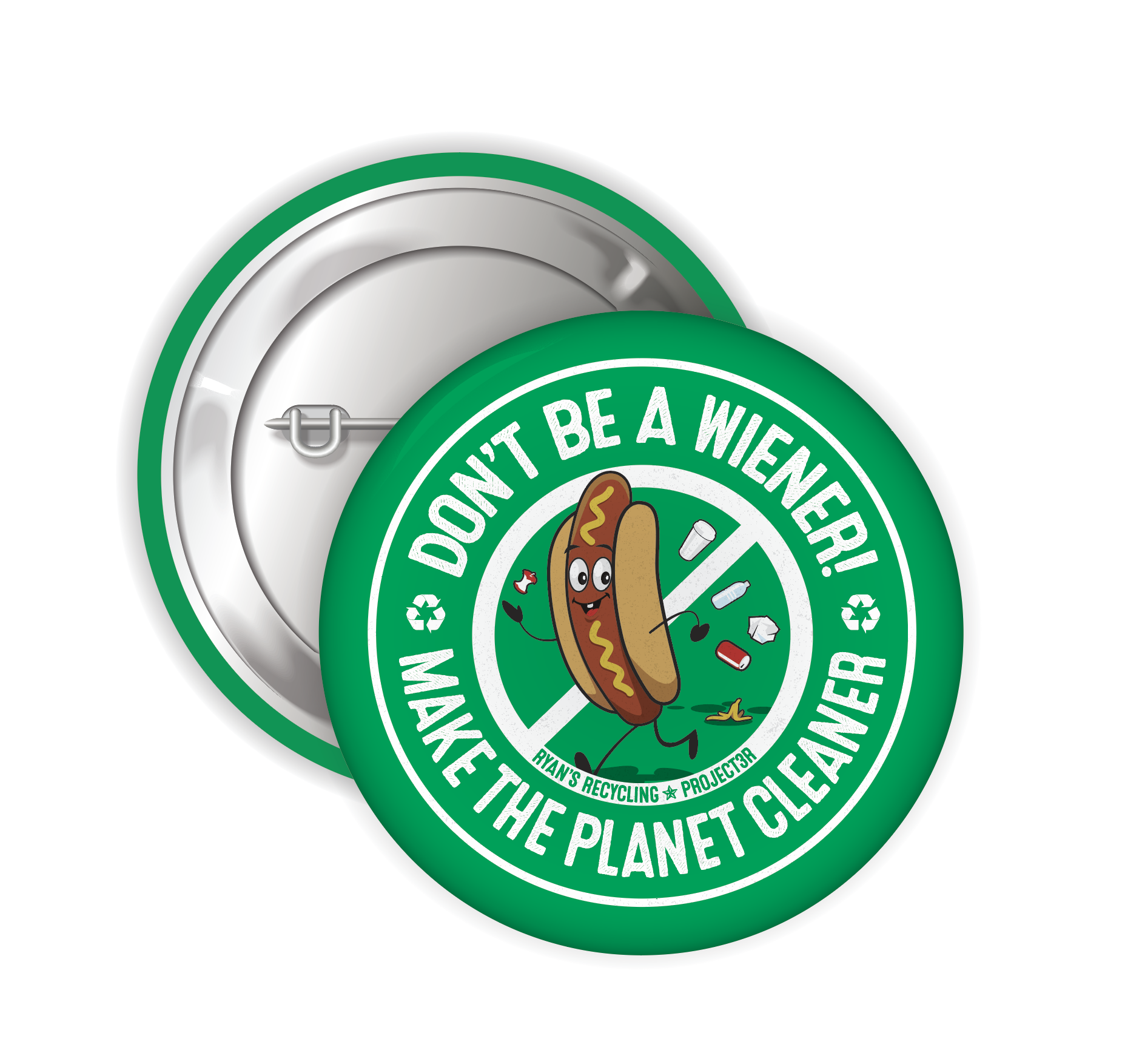 Ryan’s “Don’t Be a Wiener” buttons are the perfect way to tell the world you’re making the planet cleaner! These buttons are made from recycled sheet metal here in the USA and the paper used is also recycled. Ryan’s buttons are also printed on HP Indigo Digital Offset Presses. Indigo technology is the cleanest in the print industry – no cartridges – no toner – no inks – no fumes – zero toxic waste!