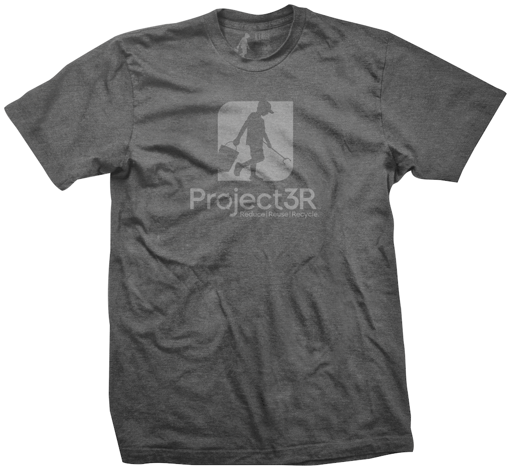 Project3R ICON shirt in a charcoal grey montone silhouette design on heather grey material. All proceeds from these shirts help fund Project3R’s beach clean up and education events! Shirts are 4.8 oz., 60% cotton, 40% recycled polyester. The recycled polyester fiber in this blend is made from recycled content including plastic bottles! Recycled poly helps reduce water usage, energy consumption and CO2 emissions when producing this garment. Not only does it look good but it’s super comfy and printed with environmentally friendly ink.