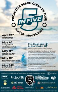 Thank you to everyone who participated in Project3R’s 5 in 5 Cleanup Tour! We completed five clean-ups in 5 weekends, starting with Dockweiler Beach in Los Angeles, then Huntington Beach, San Clemente, Ensenada, Mexico and wrapping it up in Oceanside.
